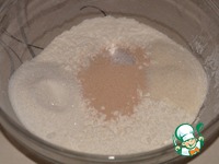 ТЕСТО: просеять 250 г муки, добавить дрожжи, 40 г сахара, щепотку соли и пакетик ванильного сахара. |