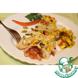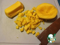 Приготовим в первую очередь манговую сальсу. Для сальсы манго разрежем вдоль, достанем косточку. Срежем кожу, мелко нарежем на кусочки и уберем в неглубокую миску с крышкой.