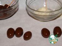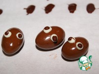 С помощью деревянной шпажки нанести капли белого шоколада, дать им застыть и нанести чёрный шоколад. |