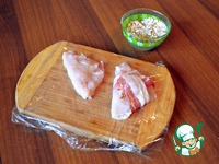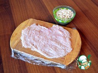 Филе куриной грудки тонко отвбиваем в прямоугольный пласт. Миндаль или фисташки измельчаем, но не в муку, а чтобы оставались довольно крупные кусочки. |