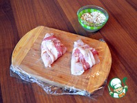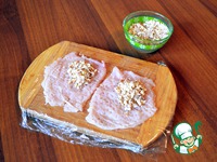 Отбитое филе режем пополам на 2 квадрата. На угол каждого помещаем ложку орехов. Филе можно по вкусу посолить, но мне показалось это излишним, т. к. обычно много соли содержится в беконе. |
