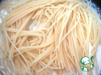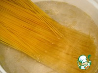 Отварить спагетти в кипящей подсоленной воде 5-6 минут (в воду обязательно добавьте немного оливкового масла). |