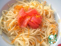 Выложим спагетти на тарелку, сверху ломтики малосольной форели, польем все оставшимся соусом и украсим цедрой апельсина |