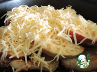 Выкладываем мясо в форму для запекания, сверху выкладываем яблоки. Посыпаем тертым на мелкой терке сыром. |