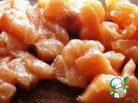 Пока варится паста, делаем соус. Лосось мелко режем. |