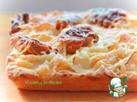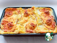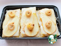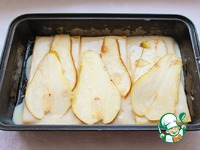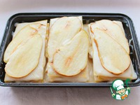 Потом опять листы лазаньи, соус, кусочки груши. Повторять, пока не прослоите все листы лазаньи. Верхний слой помазать соусом. Положить кусочки груши. |