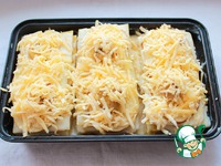 Посыпать сверху натёртым сыром. Сыр при желании можно немного добавлять внутрь лазаньи. |