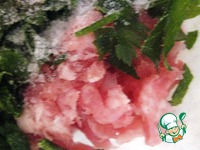 В фарш добавить мелко нарезанную луковицу шалота, зубчик чеснока и зелень. Тщательно перемешать все, посолить и поперчить по вкусу. |