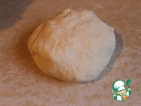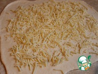 Делим его на 2 части, раскатываем одну часть в пласт и посыпаем его сыром. |
