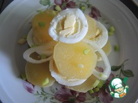 Отвариваем картофель, яйца. Нарезаем их кружочками. Лук нарезаем кольцами. |