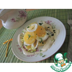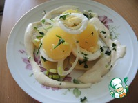 Выкладываем на тарелку картофель, сверху яйца, затем лук. Посыпаем зеленью, солью и перцем. |