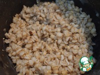 Замачиваем перловку на несколько часов (я обычно ставлю на ночь). Откидываем на дуршлаг, заливаем кипятком 1:3 и варим 35-40 минут до готовности. |