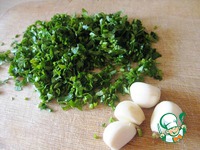 Петрушку обмыть, обсушить и мелко порубить. Очистить чеснок. |