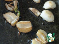 В сковороде разогреть оливковое масло, спассеровать в нем до золотистого цвета чеснок, разрезанный пополам. Вытащить чеснок из масла. |
