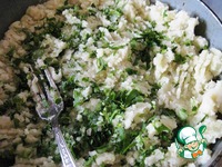 В горячее масло добавить картошку и петрушку, используя вилку размять до однородности. Посолить и поперчить на этом этапе. |