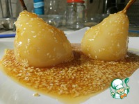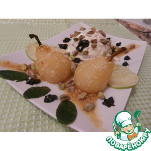 Готовые груши выложить на блюдо, оформить ломтиками лайма, шоколадным соусом, карамелью с кунжутом, листиками мяты, мороженым, фисташками. |