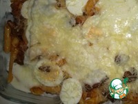 Отваренные яйца нарезаем кружочками. Фрикадельки в соусе смешиваем с отваренной пастой (немного фрикаделек оставляем для украшения). Ставим духовку на разогрев (180*). |