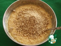 Смесь с сахаром добавить в бананы, затем ввести мучную смесь. После добавить измельченные орехи. |