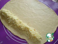 В нижней части листа выложить начинку по длине, немного выше края на 3-4 см |