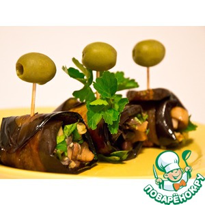 Описание: Карамельные рулетики из баклажана с грибами и фасолью. Превосходная пикантная закуска. Подойдет как для семейного ужина, так и для приема гостей.