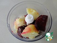 В чашу блендера положить картофель, свеклу, чеснок, уксус и оливковое масло. Взбить до однородной консистенции. Если масса кажется вам густой, то просто добавьте кипяченой воды. |