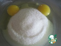 Соединяем яйца и сахар. Взбиваем в густую пену. |