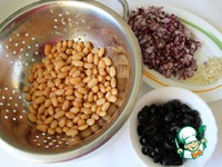 Откиньте фасоль на дуршлаг, маслины нарежьте кружочками, лук и чеснок очистите, измельчите. |