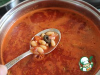 Положите фасоль и маслины в суп, перемешайте и варите 5 минут. |