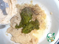 Пробить фасоль ручным блендером до состояния пюре и ввести туда 1 ст. л. соуса песто, 2 ч. л. лимонного сока и поперчите по вкусу. |