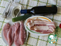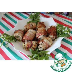 Положила на каждый кусочек филе по полоске лука-порея, свернула в мини рулет и обернула ломтиком бекона. На всякий случай сколола деревянной зубочисткой каждый рулет. |