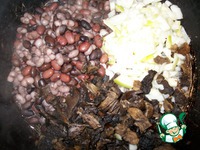 В сковороду, где уже разогревается постное масло, отправляем грибы, потом лук, потом фасоль и пассеруем все это хозяйство около 10 минут на небольшом огонечке. |