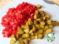 Перец и корнишоны мелко нарежьте. |