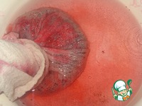 Клюквенные выжимки заливаем 2,5 стаканами кипятка и кипятим 5 минут на небольшом огне. Вынимаем, отжимаем, и выбрасываем. |