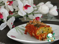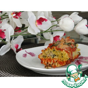Подготовьте форму для выпечки, распределяя 1/2 томатного соуса по дну формы. Разложить рулетики лазаньи шов вниз. |