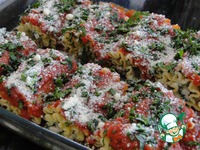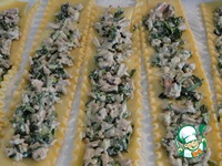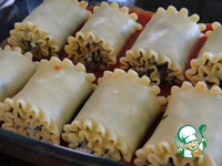 На каждый лист лазаньи распределить 3 полных столовых ложки смеси. Затем плотно скатать в рулет. Продолжить то же со всеми листами. |
