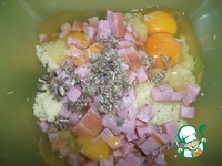 Добавляем в картофель ветчину, яйца, чеснок с орегано. |