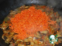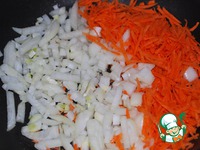 Лук режем соломкой, морковь трем на крупной терке и обжариваем около 5 минут на оливковом масле. |