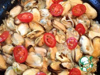 К обжаренному луку выложить мидии и порезанные кружочками помидорки черри, посолить, приправить по вкусу, добавить лимонный сок и обжарить на большом огне. |