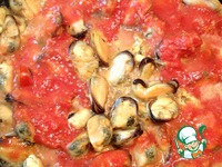 Подготовленный соус вылить к мидиям и обжарить все вместе еще минут 5 до загустения. |