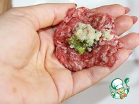 Из готового фарша делаем лепешечку, выкладываем в серединку начинку из сыра, мелиссы и фундука |