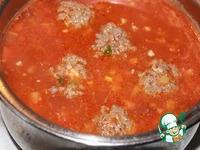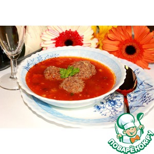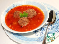 Описание: Томатный суп с фрикадельками из баранины с начинкой из козьего сыра и фундука. Предлагаю откушать яркого, насыщенного, горячего ароматного супа с фрикадельками, которые нафаршированы козьим сыром с фундуком. Заходите - угощайтесь!