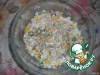 Сварить рис, положить горячим в салатницу, растереть вилкой рыбу прямо с соком из банки, добавить кукурузу, порезанный маринованный огурчик, рубленую зелень, майонез. |