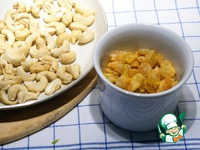 Подготовим орехи и изюм. Кешью обжарим на сухой сковороде 3-4 минуты, постоянно помешивая. Золотой изюм зальём кипятком и оставим разбухать. |
