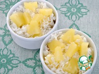 В форму для запекания выкладываю свинину, рис и сверху ананасы. Поливаю соком. Накрываю фольгой и ставлю в духовку на 15 минут. |