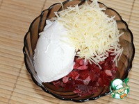 Добавила нарезанную мелким кубиком отварную свеклу. Потушила все вместе пару минут, остудила, посолила, поперчила |
