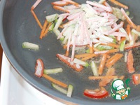 Для украшения сделала овощную вермишель: тонко нарезала морковь, болгарский перец, цуккини, обваляла в муке |
