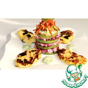 Для соуса взбила в блендере кинзу и сливки, посолила, поперчила и смазала верхний слой мильфея и чуть покапала на блюдо |