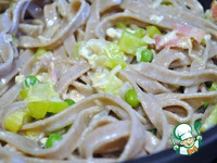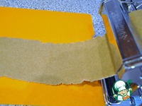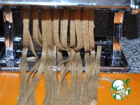 Пропущу через насадку для тальятелле. Паста готова, ставлю воду для варки и одновременно готовлю соус. |