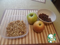 Яблоки очистить и натереть на терке (можно нарезать тонкими дольками-кому как нравится). Изюм залить горячей водой на 5 минут, обсушить. Орехи мелко порезать. |