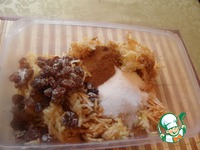 Яблоки и изюм смешать, посыпать сахаром и корицей, полить лимонным соком и дать постоять, пока сахар не растворится. |
